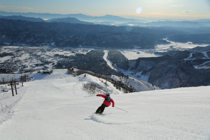 八方の楽しみ方はパウダーだけではない。名物コースの「リーゼンスラロームコース」は、”朝いちリーゼン”という言葉があるほど完ペキに圧雪されたバーンでキレキレのカービングが楽しめる。標高差800m、全長3kmの斜度変化に富んだコースは、白馬の街を見下ろす眺望も爽快で気持ちがいい。