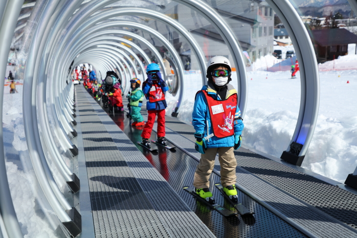「なきやまスノーランド」には全長80mのドーム付きムービングベルトがあり、専用のソリエリアとデビューパークで安全に効率よく遊べる。ビギナーにはなんと八方スキースクールのインストラクターによるワンポイントアドバイスつき。ここで滑ることに慣れてきたら、いよいよリフトに乗ってデビューゲレンデへ!パブリックスペースが隣接しているので、疲れたり寒くなったらすぐに屋内で休憩できる点も、小さな子ども連れにはうれしい。