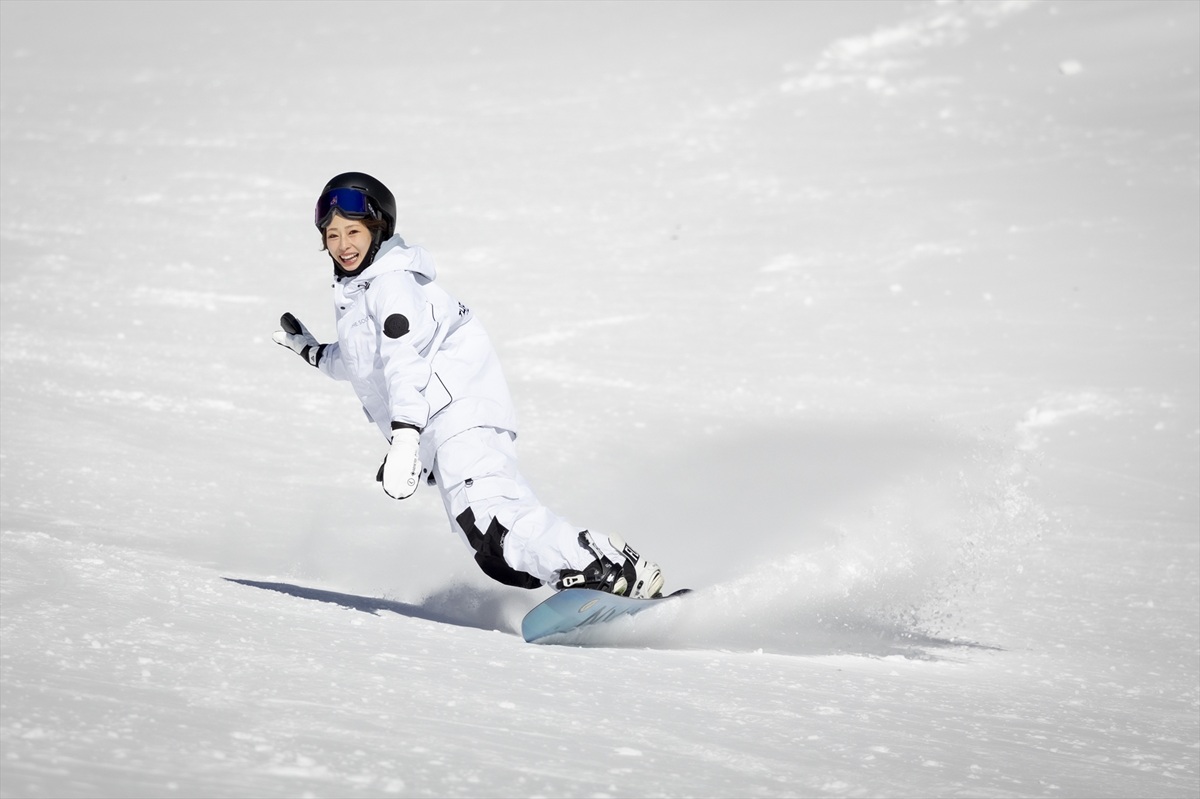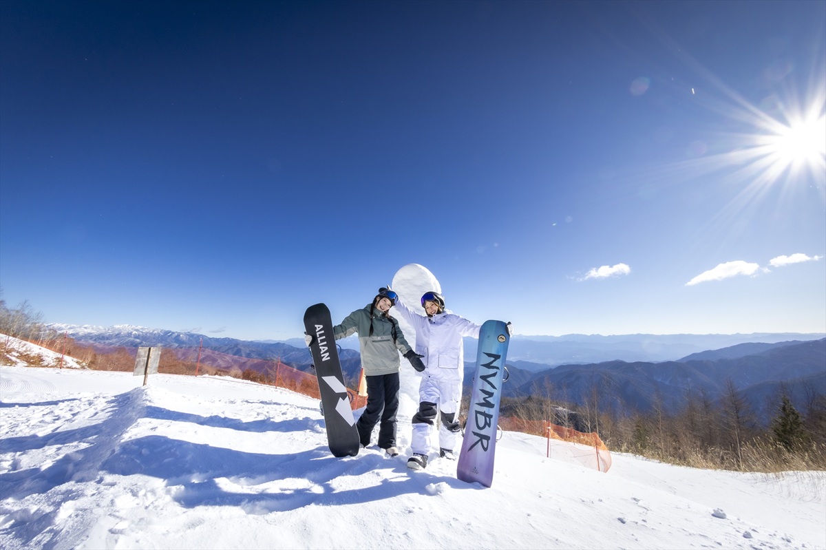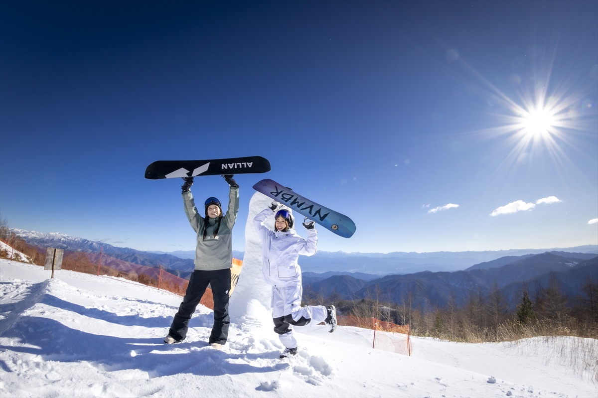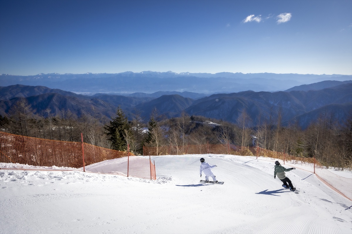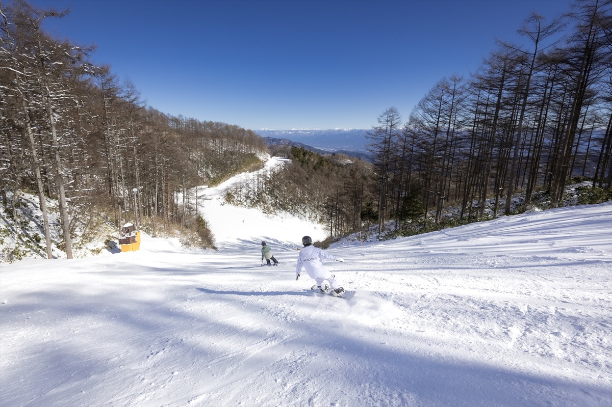 トップの標高が1600mと高いことから雪質の良さや眺望は抜群で、晴天率の高さも魅力のひとつ。この素晴らしいゲレンデを、スノーボードで思う存分に楽しむことができるのだ。