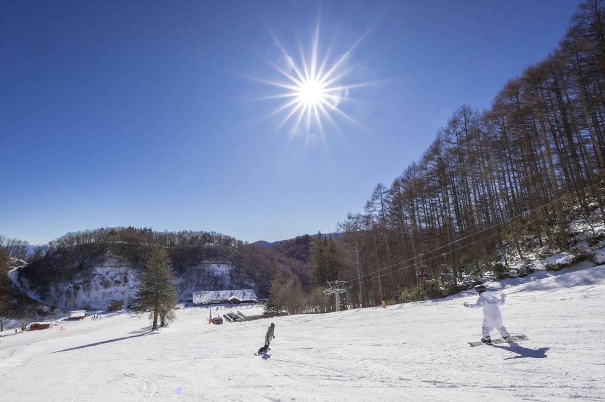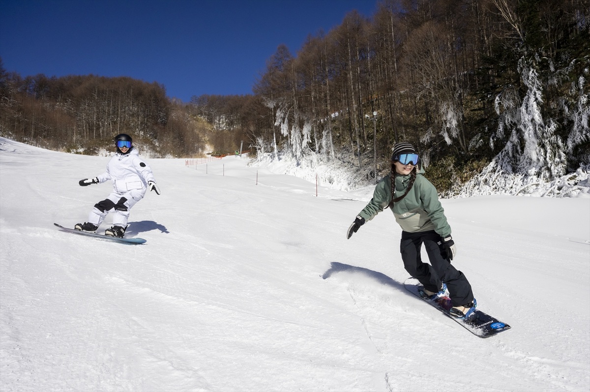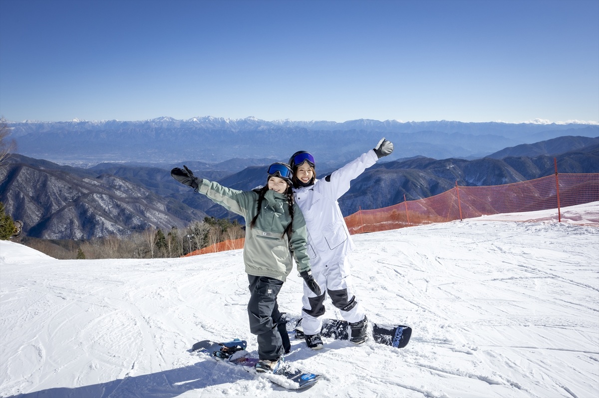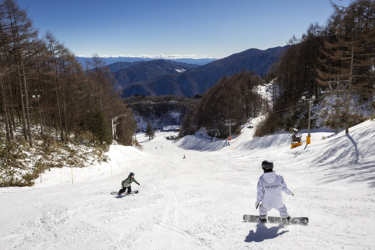 トップの標高が1600mと高いことから雪質の良さや眺望は抜群で、晴天率の高さも魅力のひとつ。この素晴らしいゲレンデを、スノーボードで思う存分に楽しむことができるのだ。