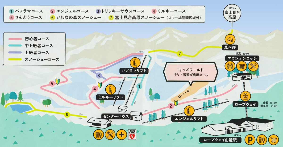 全6コースのゲレンデは初級者向きのコースが50%、中級者向きが25%、上級者向き25%の構成。リフトは全3基ですべてのコースは圧雪されていてコンディションは抜群。また全コースがセンターハウス前に滑り込むレイアウトなので、友達が別のコースを滑っていても合流しやすい。