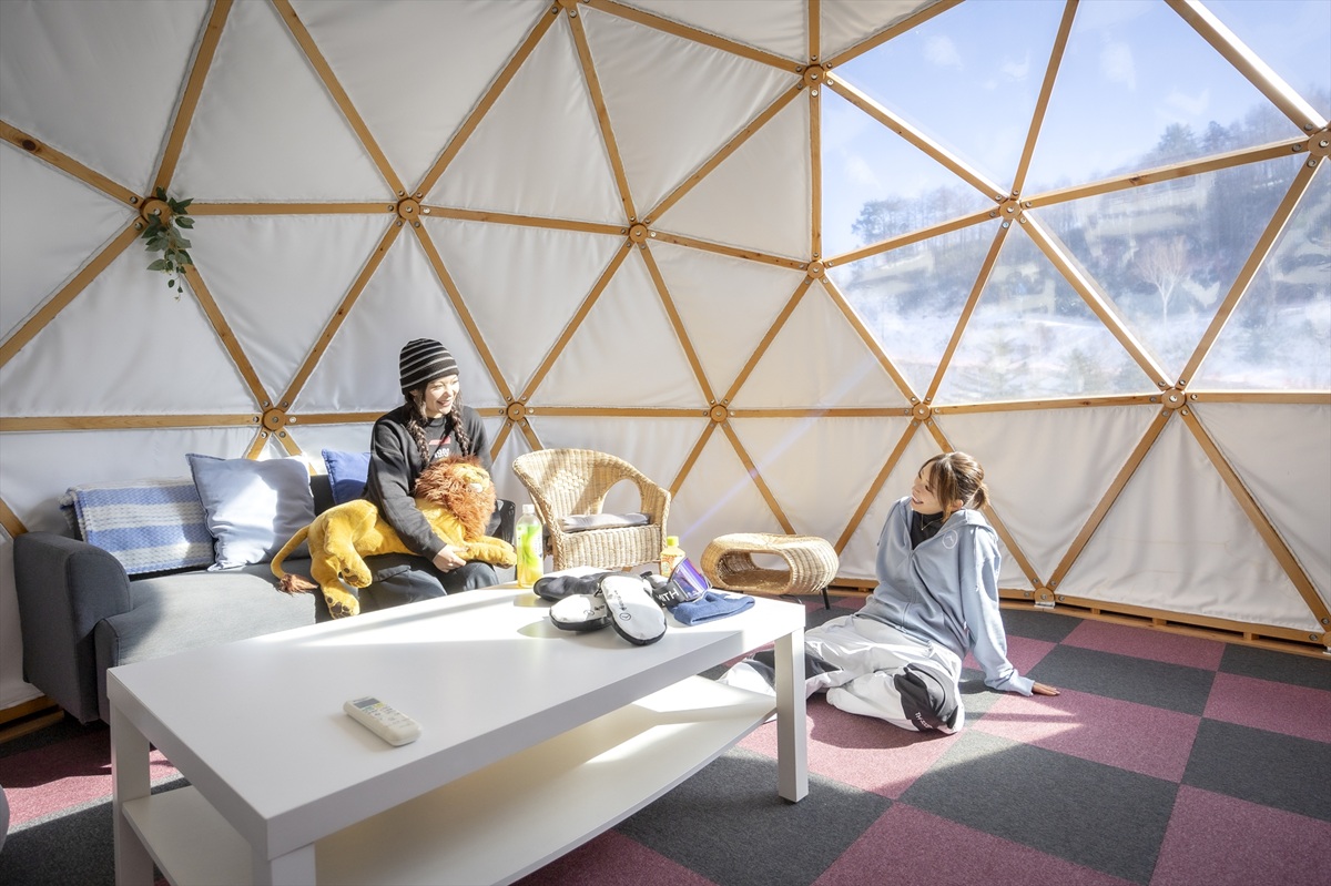 直径5mのドーム空間でこちらも暖房完備。ドームの骨組みに使われている資材は精神を安定させ、免疫力を高める香り成分があると言われている「ひのき」というのもポイント。