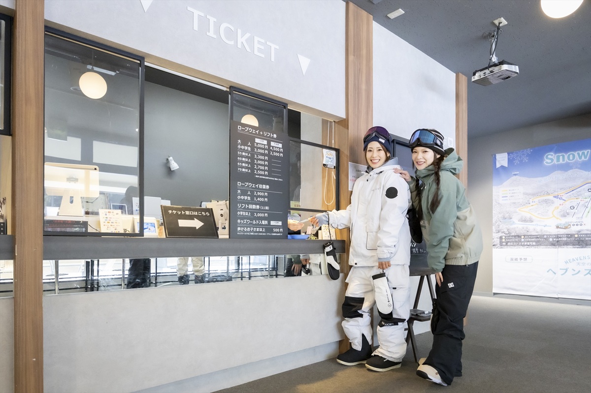 ヘブンスそのはらに到着したら、まずは山麓駅でリフトチケットを購入しよう。山麓駅内にはレンタルコーナーもあるが、今シーズンはまだスノーボードのレンタルは行ってない。