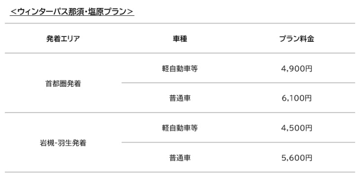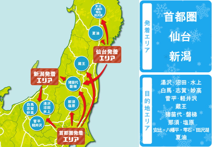 ウィンターパスは、指定する発着エリアから目的地エリアまでの1往復を定額で利用できるキャンペーンで、以下の発着エリア、目的地エリアが対象となるプランが設定されている。