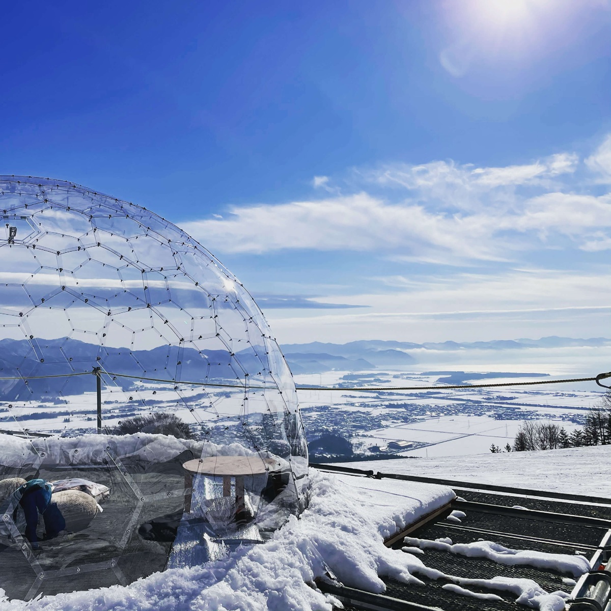 「いなスキ!クリアドーム」は第1クワッドリフトの降り場付近に設置された、フレームレスの透明なドームテント(全6個)。猪苗代湖を見下ろせる位置にあり、ドーム内からは圧巻のレイクビューが楽しめます。