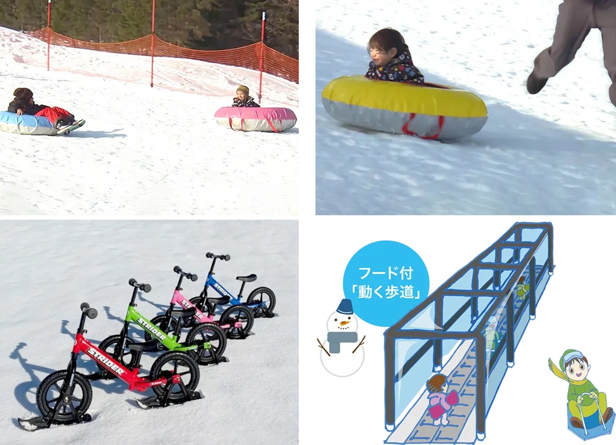 「センターハウスばんだい」の前に設置されたキッズパークには、屋根がついた動く歩道を完備。動く歩道は無料で利用できますので、初めての雪遊びにも最適です。そり・チュービング・ストライダーのレンタル(1日1,000円)も豊富で、遊具の交換もOKなので飽きずに楽しめます。