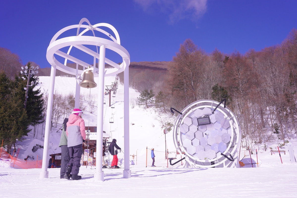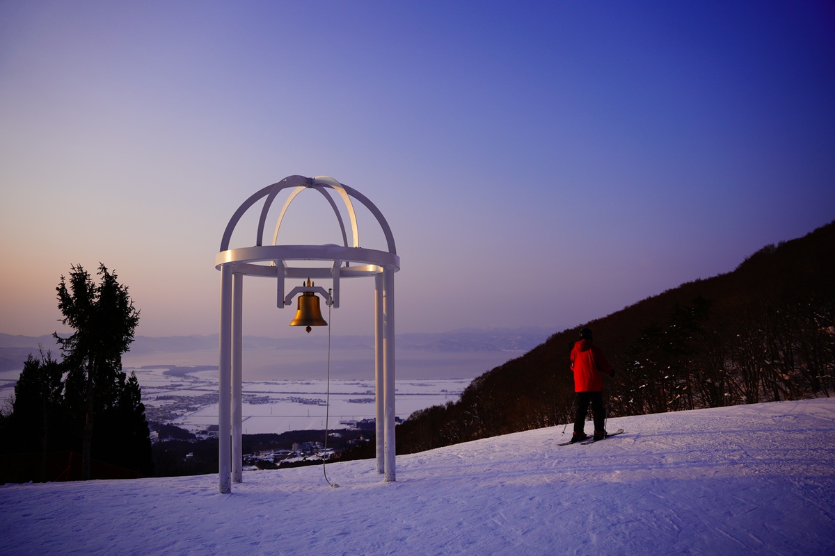 スキー場内には写真映えスポットが点在。ミネロゲレンデに設置された「幸せの鐘」からは眼下に猪苗代湖を臨むことができ、鳴らすと幸せが訪れると噂の鐘はSNS映えスポットとして大人気。標高1,255メートルの山頂から拝む猪苗代湖と福島のシンボルである磐梯山が共演する絶景は、ここでしか出会えない景色。壮大な自然を眺めながら大迫力のパノラマビューに飛び込むように滑り降りる体験は、興奮することマチガイない。