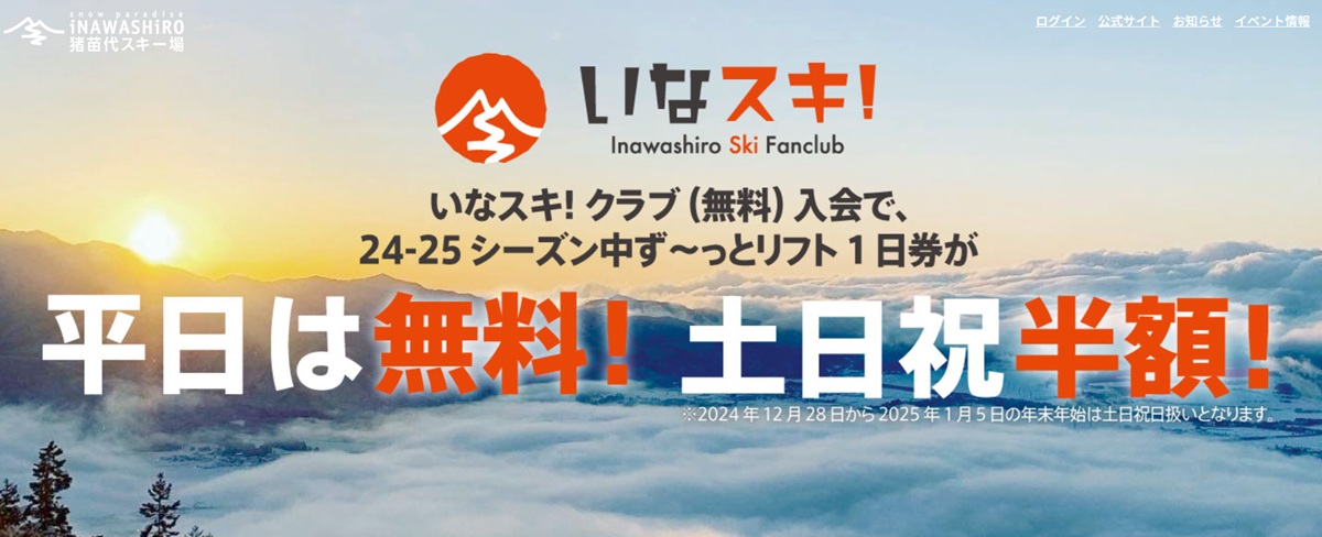 無料会員登録で、リフト1日券が平日無料!土日祝日は半額に!!