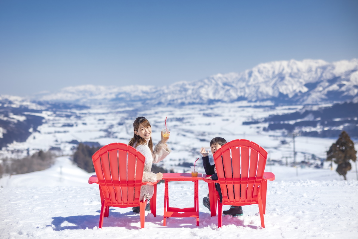 とにかく広くて全景が拝めるゲレンデが自慢の石打丸山。リフトに乗ってゲレンデに降り立つと、ブランド米「コシヒカリ」で有名な魚沼平野と、その先に雄大な越後の山々がそびる大パノラマが目の前に広がる。どのコースからでも絶景に飛び込むような爽快感を味わいながら、ダイナミックにライディングを楽しむことができるのは、石打丸山だけの特権だ。