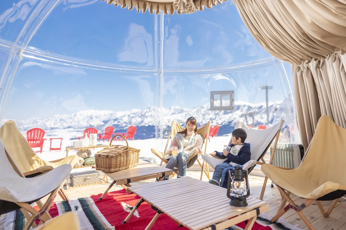 他にもスノーガーデンエリアには、スキーやスノーボード以外に雪遊びを楽しめるアクティビティが盛りだくさん。スノーシュー、スノーレーサー、ソリ、チュービングなど、大人も子ども一緒になって思い切り遊べるので、初めての雪山というキッズだって大喜びのはず。子どもと遊んでいる間、お母さんに快適なドームテントでゆっくり過ごす時間をプレゼントしてあげるのもアリだろう。