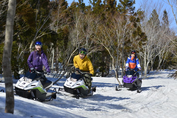 スノーモービル未経験者でもトライしやすい体験コースのほか、1時間程かけて森をめぐる林間コースなど本格的なツアーも楽しめる。