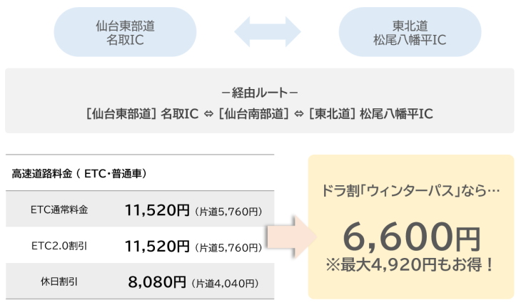 例えば、仙台東部道の名取ICから東北道の松尾八幡平ICに向かう場合、往復の通行料金が最大4,920円も割引になる。