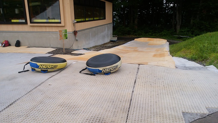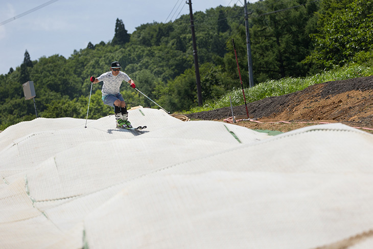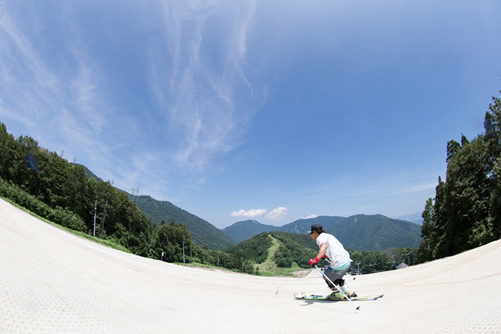 自分の普通のスキーを使うのが心配なら、特殊なメタルシートを滑走面に配したサマーゲレンデ仕様のスキーやスノーボードがあり、かぐらではレンタル(スキー60台、スノーボード25台)でも用意しているので、ぜひ試してもらいたい。