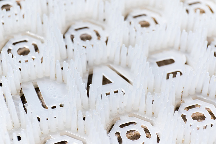コース全面に敷かれているスノーマットは、従来までのスノーマットよりも、しなやかな滑走感と優れたエッジグリップが得られ、雪の上を滑る感覚に非常に近いと評価の高い「PIS LAB(ピスラボ)」。ピスラボのマットは1平方メートルあたりに約2万本もの突起物(ピン)が並んでブラシ状になっていて、その上を滑走する。ピンは、しなやかで耐久性のあるポリエチレン製で、摩擦を軽減する加工は施されているが、残念ながら雪よりも抵抗は大きく、実際には雪上ほどの滑走スピードは出ない。
