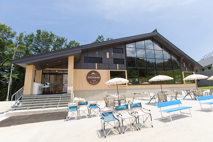 比較的涼しい高原とはいえ、夏は気温も高くなることもあるので、細やかな休憩や水分補給は欠かせない。食事や休憩のおすすめは、ロープウエー山頂駅からリフト乗り場へ向かう途中にある、カフェ&レストラン「SNOWMAN(スノーマン)」へ。今シーズンで4年目を迎える、とてもきれいな施設で開放的な空間に144席を用意。家族連れでも利用しやすいようにキッズスペースも確保している。