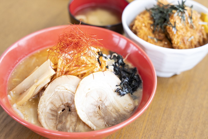 どれを食べて良いか迷ったら、定番というか人気なのが「山小屋あじと」。新潟のソウルフード「タレカツ丼」や「火山ラーメン」は地元の越後味噌をベースにして作られた辛味噌をスープに使っていて絶品です!