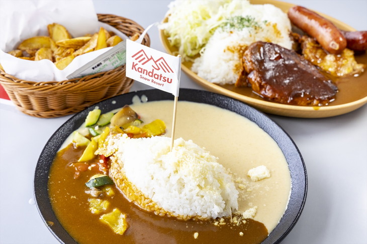 もう一軒、「KANDATSU THE KITCHEN(カンダツ ザ キッチン)」のカレーも間違いない美味しさ。2色のカレールーに粉チーズがトッピングされたが人気No.1メニューの「神立高原カレー」やハンバーグ、鶏の照り焼き、ウインナーが載ってボリュームたっぷりの「肉盛りプレート」で、がっつりいくのもアリですね(笑)。