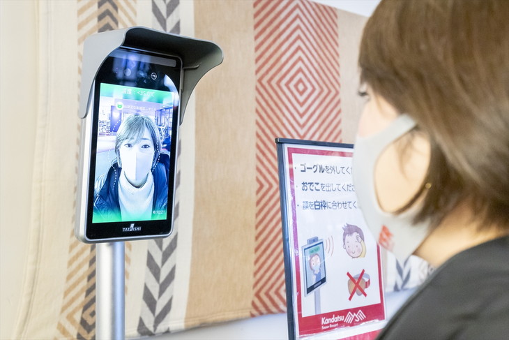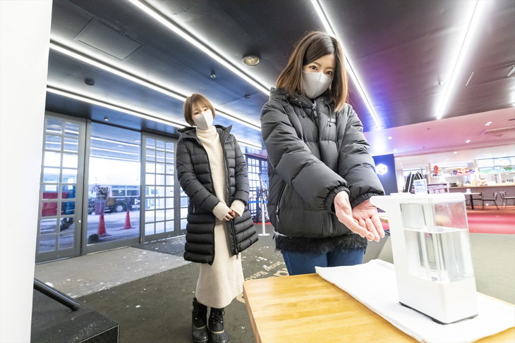 基本的にゲレンデへはGROUND BASEを通過して移動するのですが、GROUND BASEの入り口で、来場者ひとりひとりに検温をお願いしていました。センサーに顔を近づけるだけで、緑のランプが点灯すればOK。赤で点灯した場合は、スタッフがあらためて別の方法で検温しチェックしてました。