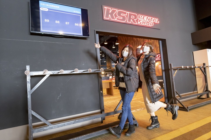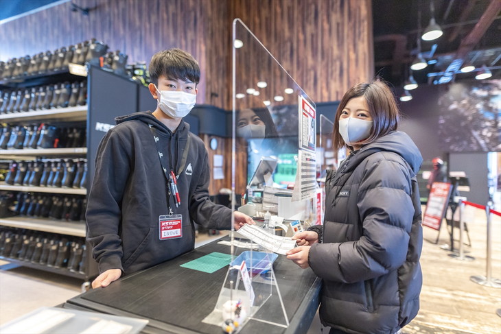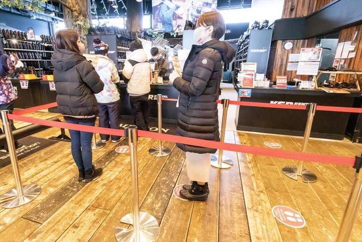 GROUND BASEの3階にあるレンタルは、すごく充実していることもあって週末の午前中はとくにレンタルを借りる人の数が増えます。かなり広いスペースで利用しやすさも魅力ですが、今シーズンは整理券を発行し、整理券の番号順に案内(掲示板に番号を表示)してくれるので、混んでいても密状態になりにくい工夫をしていました。