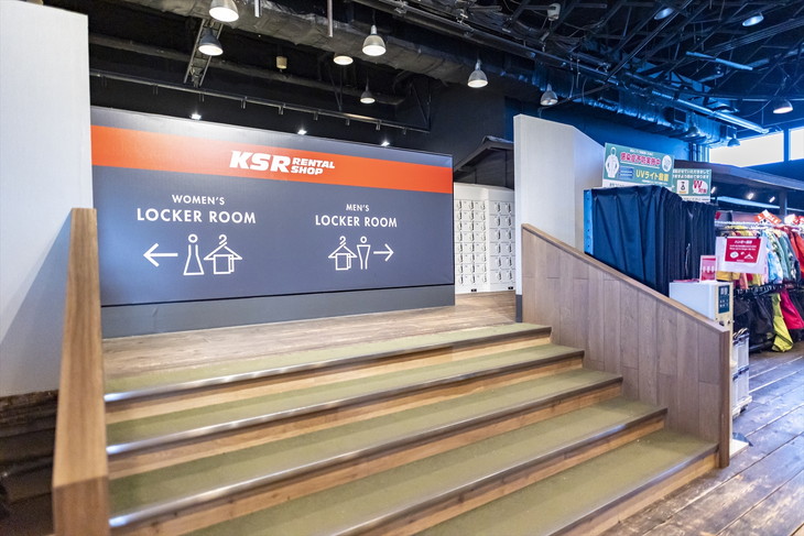 レンタルウエアは好評のバイキング形式。自分の好きなウエアを自分で選べるのって楽しいですよね。自分のウエアを今度買おうかなと思った時に、上下の組み合わせとか、気になる色やデザインが似合うかどうかとか、実際に借りて試してみるのに利用してもいいかも(笑)レンタルの奥に更衣室&ロッカールームがあるので、すぐに準備してゲレンデに出られるのは楽チンだと思います!