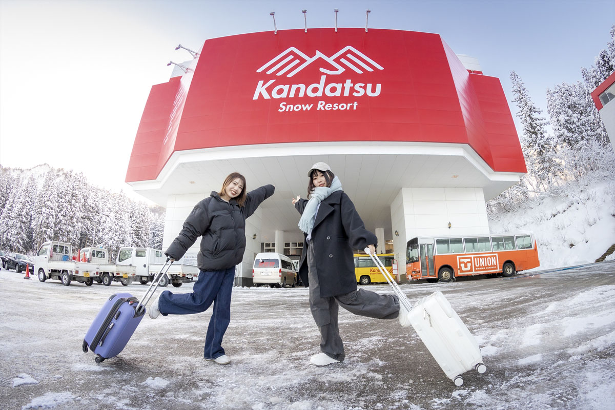 無料シャトルバスが到着するのは、神立スノーリゾートのベースに建つ巨大な「GROUND BASE」。リフト券売り場やレンタル、レストランなどのスキーセンターとしての機能はもちろん、温浴施設も備えた多機能施設だ。