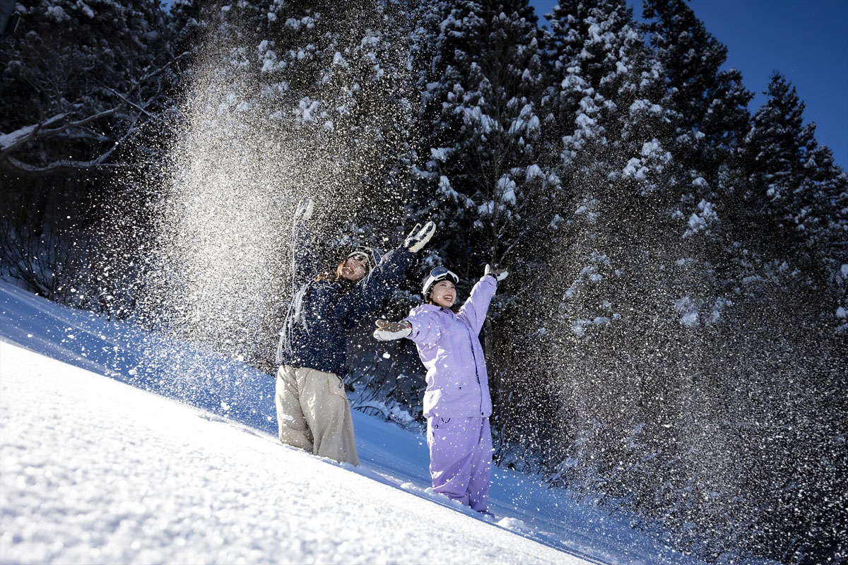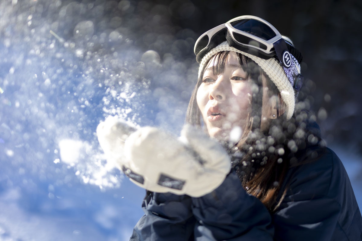 神立スノーリゾートは滑りやすい天然雪100%が魅力のひとつ。降雪後のゲレンデ上部の雪質はまさに極上。手のひらにすくった雪に息をかけるだけで、雪の粒のひとつひとつがキラキラと舞っていくので試してみよう。