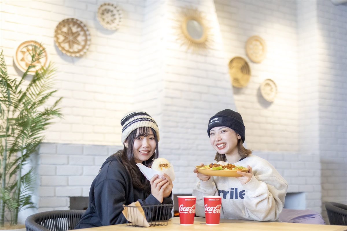 ゲレ食メニューでは珍しいタコライスやトロ〜りとした半熟卵が乗ったロコモコといったメニューも、スノボ女子に大好評。スイーツも充実しているので、休憩のタイミングにも「Café KSR」をチェックしてみよう!