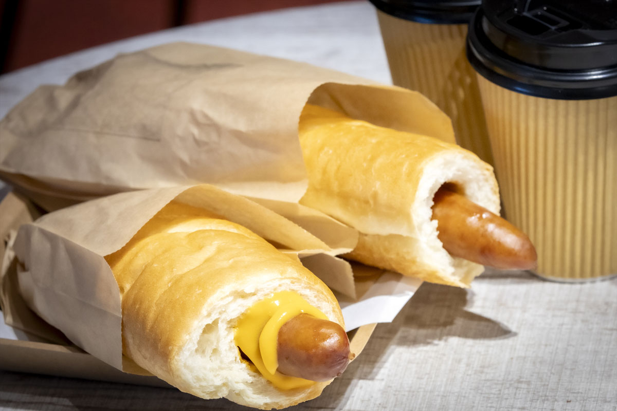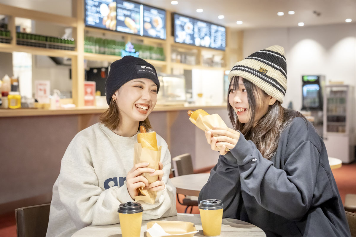 スキー場に到着してから朝食を食べたい、帰りがけに小腹を満たしたいというときは、「GROUND BASE」1階にある「SNOW CAFE」の名物「カンダツドッグ」がマジでおすすめ。4種類のソースが選べ、ドリンクとのセットも用意。朝は7時30分から平日や日曜日は17時30分まで、ナイターのある金曜日と土曜日は、なんと夜25時(オーダーストップ24時)まで営業している。