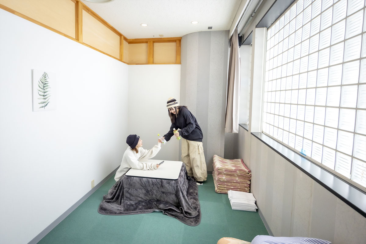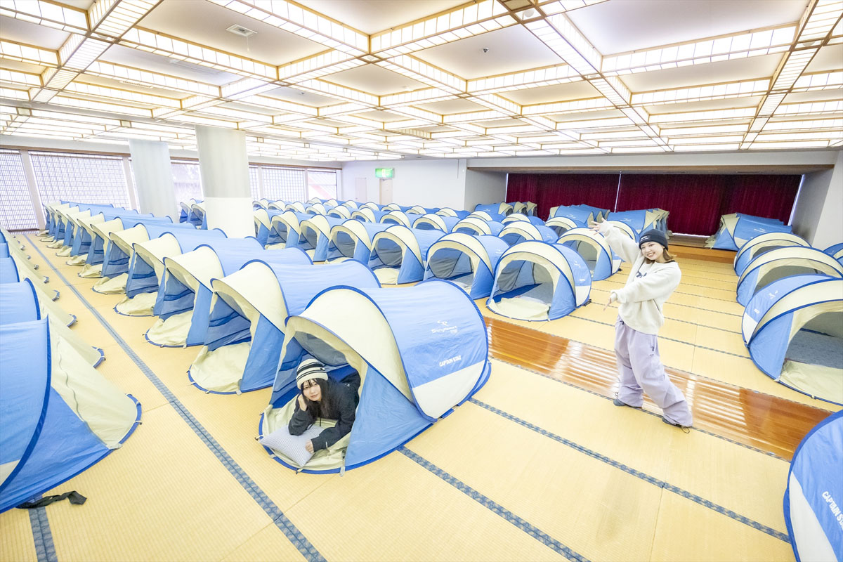 神の湯内には仮眠施設も用意。運転が心配だから、しっかり寝て疲れを少しでも取ってから帰りたい、前泊して朝から元気に滑りたい、という人におすすめ。一人分のテントの中で仮眠ができるからプライバシーも安心。入浴と仮眠とリフト券、さらにタオルと朝食まで付いたパック(9000円)も用意している。