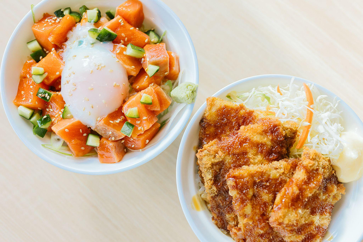 人気メニューは、新潟県産ポークを使った「タレカツ丼」と「サーモンユッケ丼」。