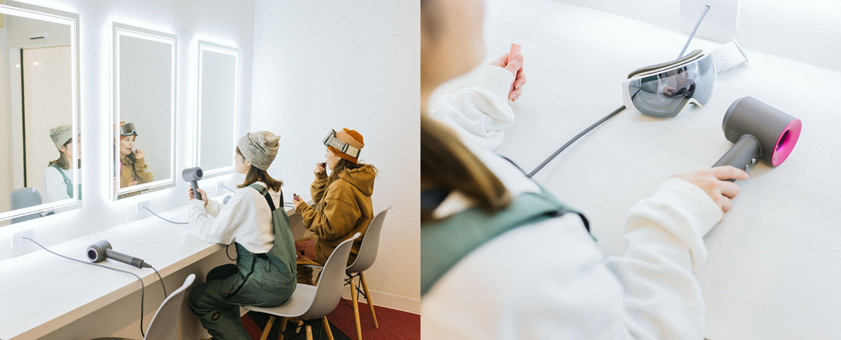 なんと、こちらにもダイソンのヘアドライヤーが完備されていて、滑り終わった後や食事後の身支度に超便利。雨や雪の日、汗で乱れた髪をリセットできるのって、本当にありがたいですよね。