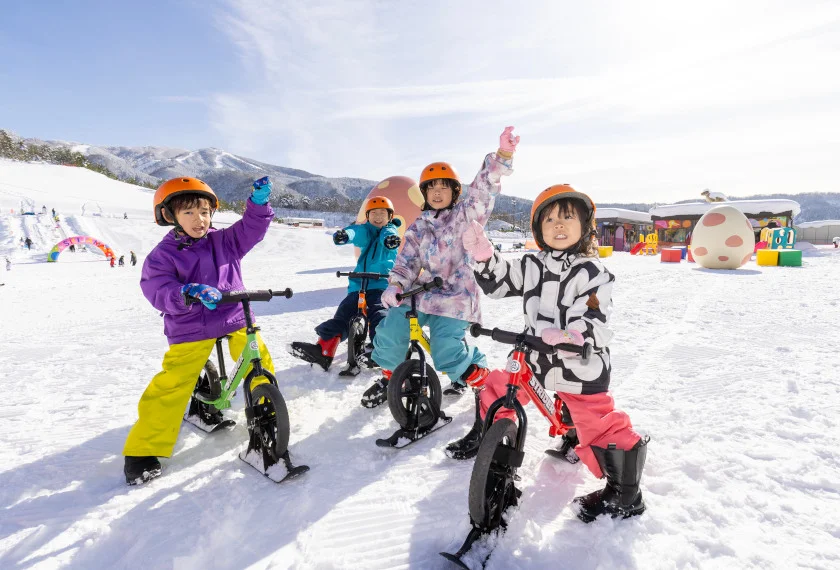さらに、初級者コースの「サウスコース」は、そりとストライダーでの滑走OK。第1リフト「フォレストライン」に乗車し、全長862mのコースをそりやストライダーで滑り降りることができます。子どもも大人も、滑らなくても非日常の雪山体験ができるところも魅力です。