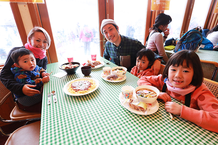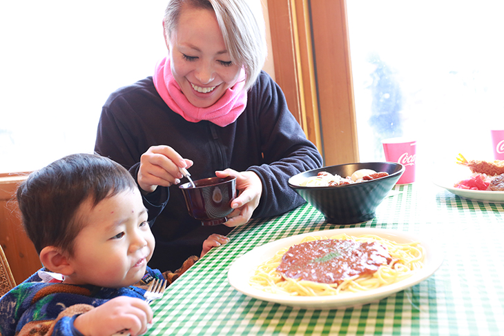 午前中、元気よく遊んだらお昼は美味しいゲレンデレストランでゆっくりしよう。山麓にあるレストラン「ネージュ」は北米風ログハウスのオシャレな建物だ。テーブル席の他に靴を脱いで上がれる座敷スペースや、テラス席があるので好みに合わせた場所でくつろげる。