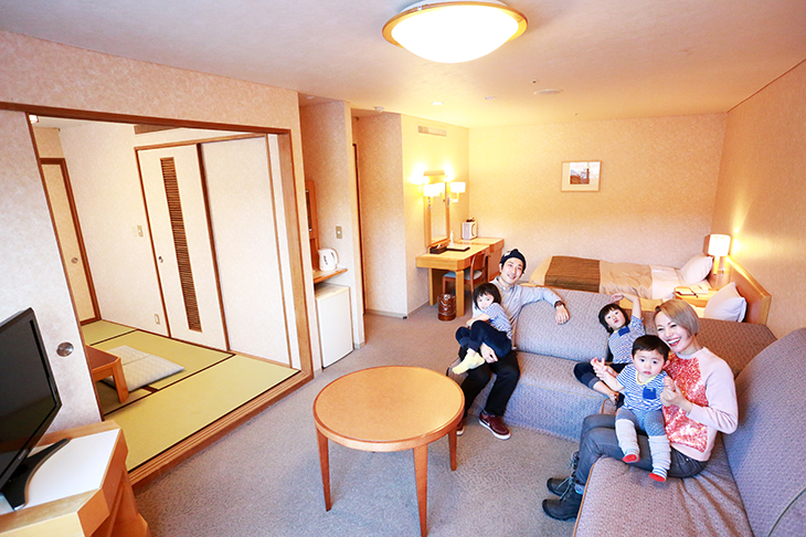 まるまる1日元気に遊んだ家族は今日の宿泊地へ。ヘトヘトになるまで遊んでも心配無用、軽井沢スノーパークには隣接した素晴らしい直営ホテルがある。