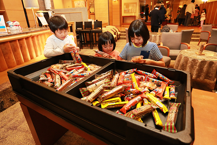 食後は天然温泉『相生の湯』に入ってゆっくり過ごすのもいいが、まだまだ元気な子どもたちは館内イベントに参加することに。まずは、お菓子詰め放題ゲームに参加。なんと参加費は無料で、渡された袋に制限時間内であれば好きなだけお菓子を詰めることができる。子供たちは袋が破れそうなほどパンパンにお菓子を詰めて、ご満悦の様子だった。