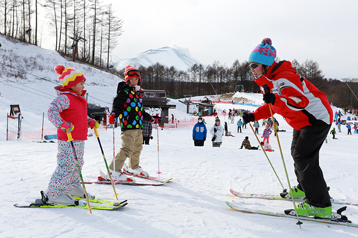 「第1ペアリフト」に乗ると、一気にゲレンデトップへ行くことができる。リフトを降りると雄大な浅間山が目の前に!都心では見られない絶景に子ども達も感動したようだ。ゲレンデトップと言っても滑る際は初級、中級、上級とレベルに合ったコースを選んで降りてこられるので安心。また「つぼ型」のコースレイアウトになっているので、全てのコースがゲレンデ下部で合流し迷子の心配もいらない。