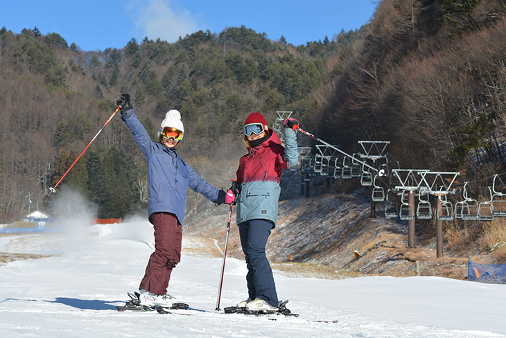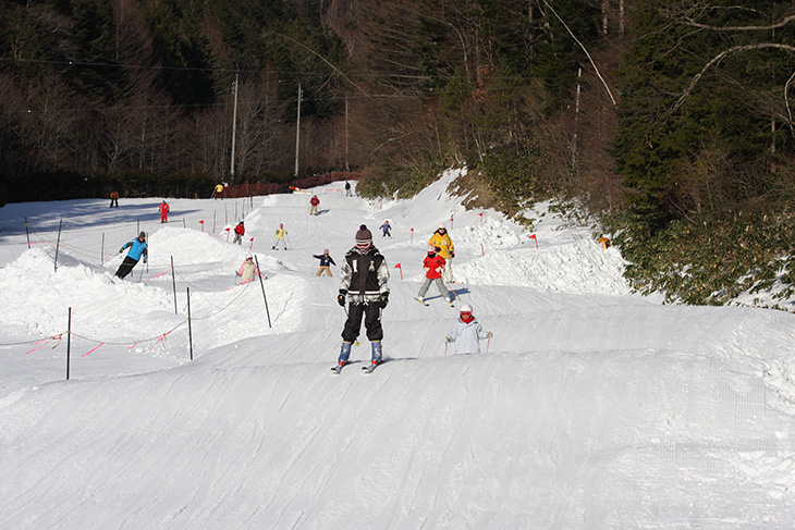 きそふくしまスキー場は初心者大歓迎。ゲレンデベースにはフラットでゆるやかなロングコースが用意され、子どもや初心者が雪上デビューするのにぴったり。ビギナーでも「ファミリーコースA」と「ファミリーコースB」を繋いで、全長2500mの長い緩斜面をたっぷりと滑れる。