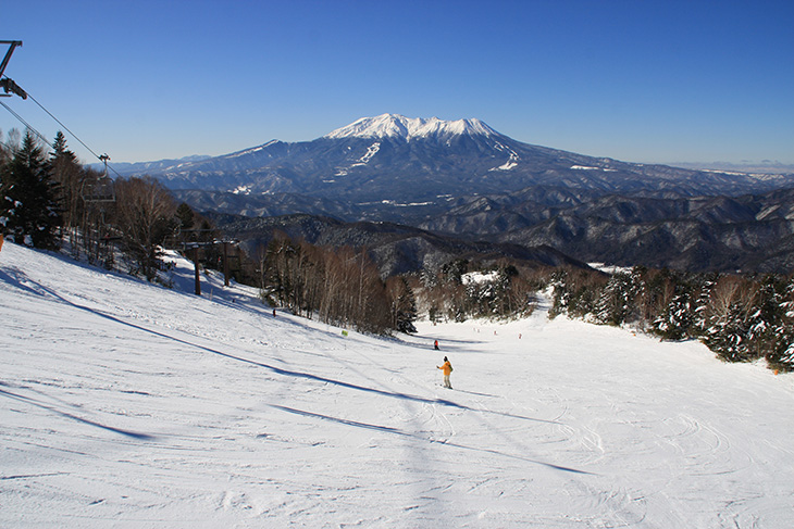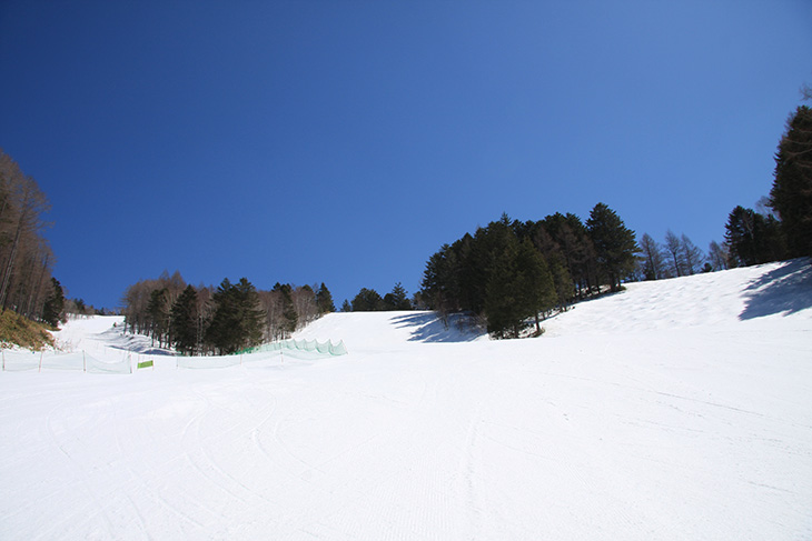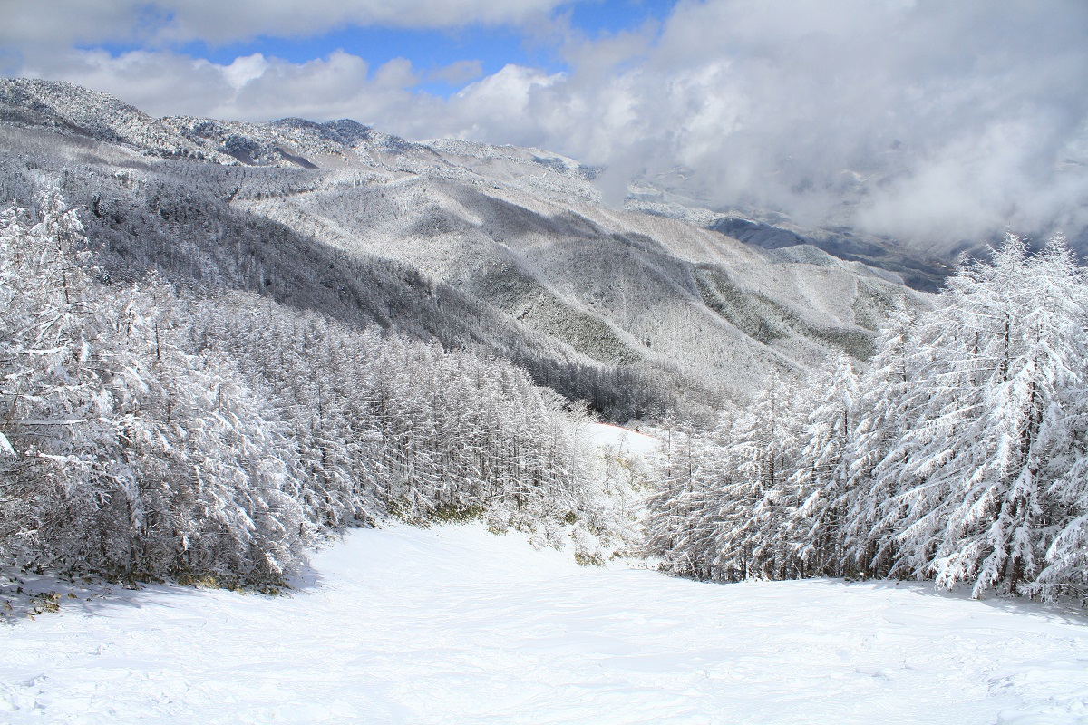 最上部から滑り出す「スカイコース」は雪質良好。雪に覆われた美しい木々に囲まれながら、爽快なロングランが味わえる。広がる青空を背景に、御嶽山に向かって滑りこむ開放感もたまらない。