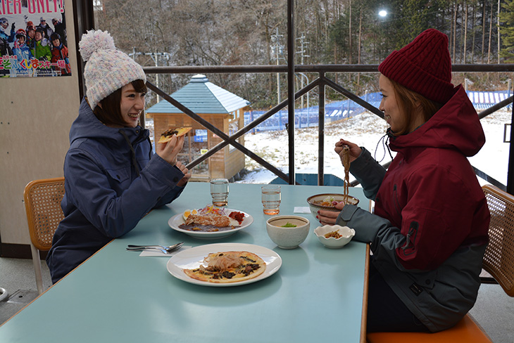 レストランは、ゲレンデベースやコースの途中、リフト降車場近辺などにバランス良く点在。なかでも、スキーセンター2階の「レストランウインキー」は、カレーや麺類といった定番メニューをはじめ、子どもに大人気のキッズプレートからシニアに好評の和食まで用意。焼きたてピザも味わえ、幅広い世代に対応した豊富なメニューを取り揃えている。