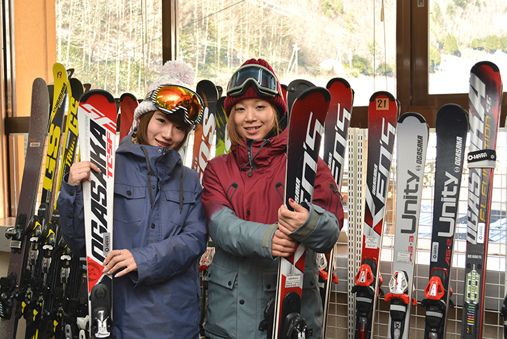 スキー・スノーボード用具は周辺に点在する3軒のレンタルショップで借りることができる。なかでも、スキーセンター横にある「レンタルオオハタ」は、ゲレンデ開業から営業している老舗のレンタルショップ。有名スキーブランド「オガサカ」の直営店でもあり、一般レンタルのほか、オガサカのニューモデルに乗れるエキスパートレンタルも実施。基礎系や競技スキーの上位モデル、パウダースキーなどを体験したい人はぜひ利用してみよう。