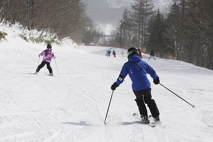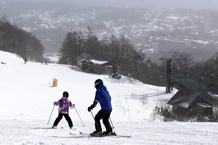 御成山ゲレンデからは眼下に温泉街を一望でき、眺望を楽しみながら迂回コースを通ってゆっくり滑り降りられる。「天狗の壁」と呼ばれる上級斜面を通ることもできるので、腕に覚えのある人は挑戦してみよう。