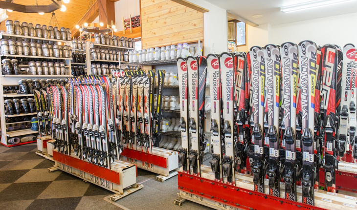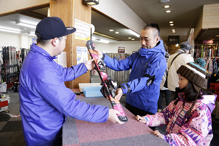 スキー場に着いたらまずはレンタルコーナーに。一般レンタルのほか、スキーやスノーボード、ウエアのハイグレードモデルも借りられる充実の品揃えになっている。ウェブによる事前予約限定の「手ぶらでレンタル」は、リフト1日券にスキー&スノーボード一式、ウエアのレンタル、グローブやゴーグル、帽子のレンタルを含めて大人8200円、子供6000円という超お得なセット(支払いは現地で現金のみ対応可)。家族でスキー場に出かけると何かと荷物が多いが、用具も小物もまるごとレンタルすればとっても身軽に。
