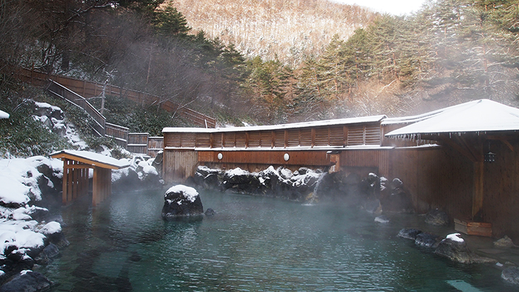 リニューアルして間もない「西の河原露天風呂」は、100人以上が浸かれるという開放的な露天風呂が自慢。山に囲まれながら雪見風呂が味わえる、これぞ秘湯と言える魅力的な温泉だ。