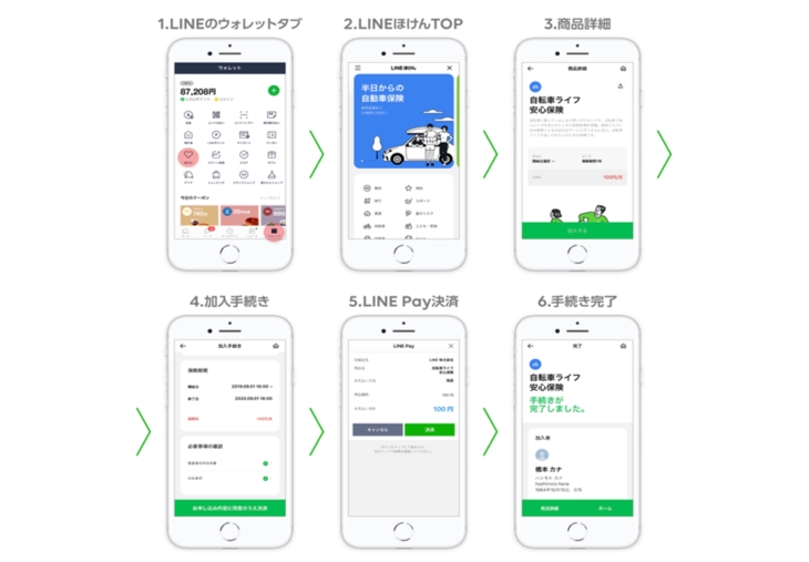 LINEほけんにアクセスして、上記のような簡単なステップでLINEで契約が完結できます。