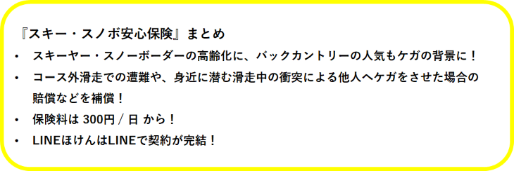 LINEで簡単に加入できるLINEほけん。1度使うとリピート利用される方が多いのも特徴です。『スキー・スノボ安心保険』以外にも、海外旅行保険などもあるので、身近な保険はぜひLINEほけんで!