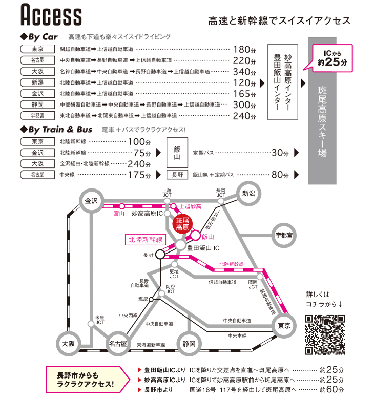 斑尾高原へのアクセスは、上信越道の豊田飯山ICまたは妙高高原ICから約25分。北陸新幹線が開通したことで飯山駅から定期バスでアクセスできるようになり、電車でも行きやすくなっている。