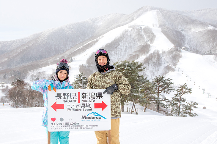 斑尾高原にはインスタ映えするフォトジェニックなスポットがたくさんある。写真をいっぱい撮って想い出をシェアすることも、二人の距離を縮めるポイントだ! 斑尾高原はコース内に長野県と新潟県の県境がある日本でも珍しいスキー場なのだが、ゲレンデへ出てすぐのところに県境の位置を示す看板が立っているので、まずはここで記念撮影!