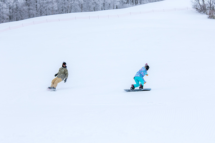 ただし、相応の滑りのスキルがなければ安易にツリーランコースに入り込んではダメ。彼女は初滑りでまだ足慣らしができていないようなので、まず滑りやすい整地コースにエスコートしてあげよう。ゲレンデベースはすり鉢状の地形になっており、いくつかの緩斜面が取り囲んでいる。まずはこのエリアを一緒にめぐってウォーミングアップをしよう。ときには滑りのアドバイスをしてあげたり、自分が滑りたい気持ちはグッと抑えて、彼女のペースに合わせてあげることで好感度アップ間違いなし!