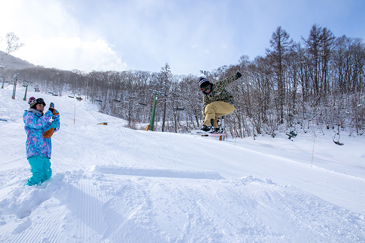 午後はスキー場の中央に位置するコース「ジャイアント」を滑りつつ、キッカー・ボックス・レールなど多彩なアイテムが揃う「Free Ride Park」でカッコいい滑りをアピール!ただ怪我をしたら元も子もないので、くれぐれも無理はしないように。