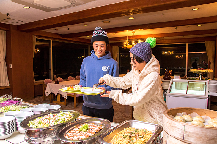この日利用したのは斑尾高原ホテル。エントランスからコースに滑り込める好立地なうえ、露天風呂を備えた天然温泉を完備し、信州産の食材を取り入れたおいしい料理にも定評がある。